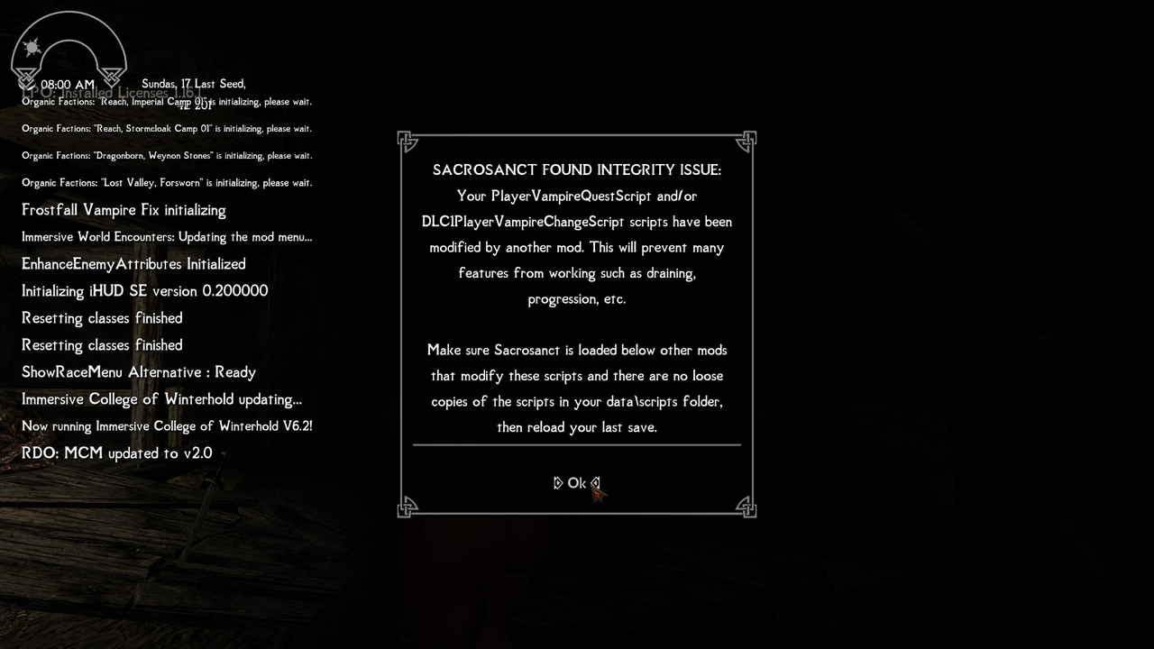 I tried make the mod run with just these mod enabled: Address Library for SKSE PluginsAnimation Queue Fix Paired animation Improvement SSE Engine Fixes Skyrim Priority SE AE – skse plugin SkyUI, MCM helperUSSEP Vanilla Script’s (micro)OptimizationPower of Three Tweaks Powerofthree papyrus extended Open animation replacer NemesisSpell Perk item distributor (SPID)Keyword Item Distribution Sonders Keywords Item Distribution Papyrus Extender PapyrusUtil (need them for other mods)