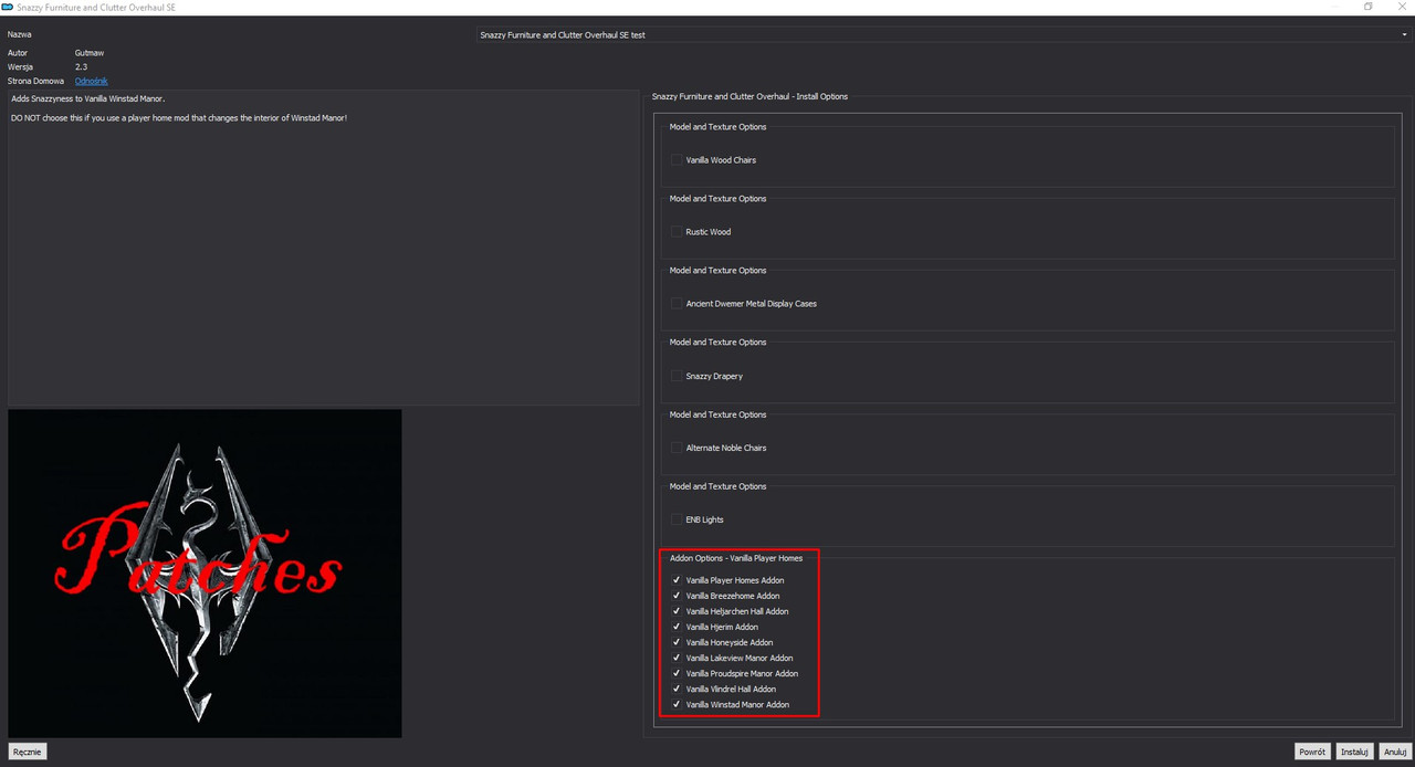 Misc: - Updated patches based on most current version of corresponding mods, and moved all patches to a new site (see description) - Created a test cell that has every unique snazzy item to view - Added several new player home patches - Removed all edits from vanilla player homes and made optional addons for them - Added several custom player home patches, located on the patches page. - Removed the USSEP dependency and instead made a patch available on the patches page.