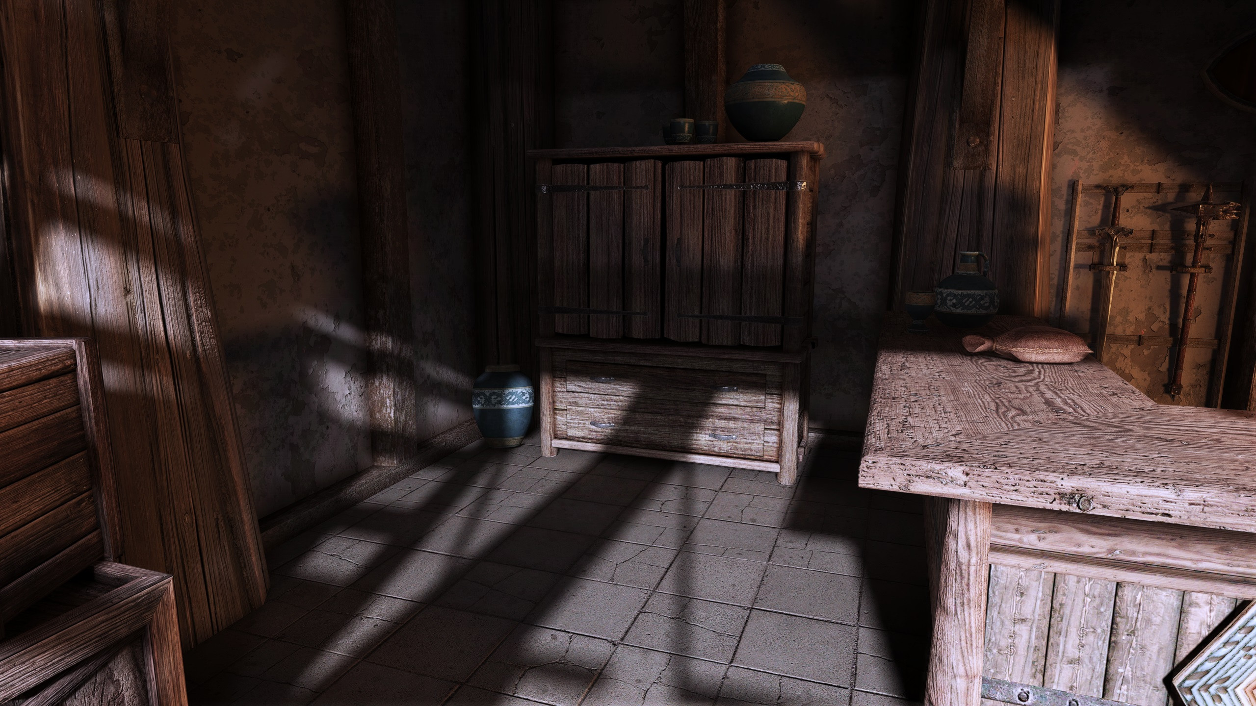 At Warmaiden's below the stairs, to the left of the cabinet there's a vase on the ground. I knocked it over, and when I went to sweep it up, after I clicked on the broom, it just uprighted itself is all, the broom didn't show and my character didn't sweep. I tried this several times, close to the vase and further away, each time the same, it just popped back up right, no broom sweeping.